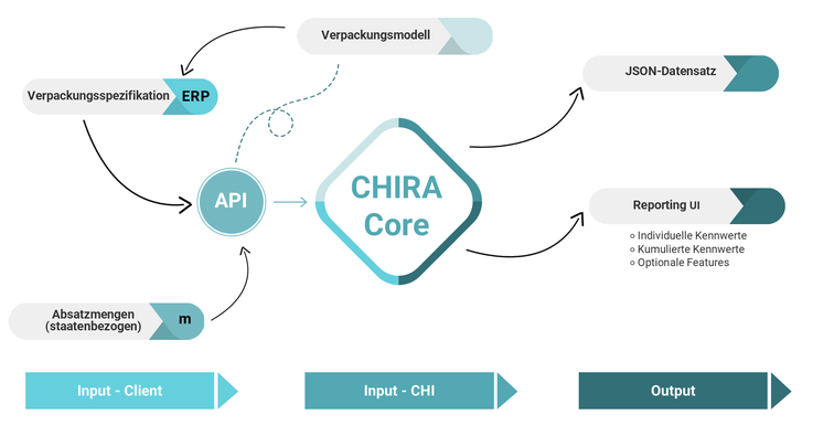 Als Input werden die Daten der Verpackungsspezifikationen und staatenbezogenen Marktmengen benötigt. Die erforderliche Datengranularität wird durch unser Verpackungsmodell definiert. Dank API-Schnittstelle besteht eine direkte Verbindung zum Kernstück der Berechnung, dem CHIRA Core.